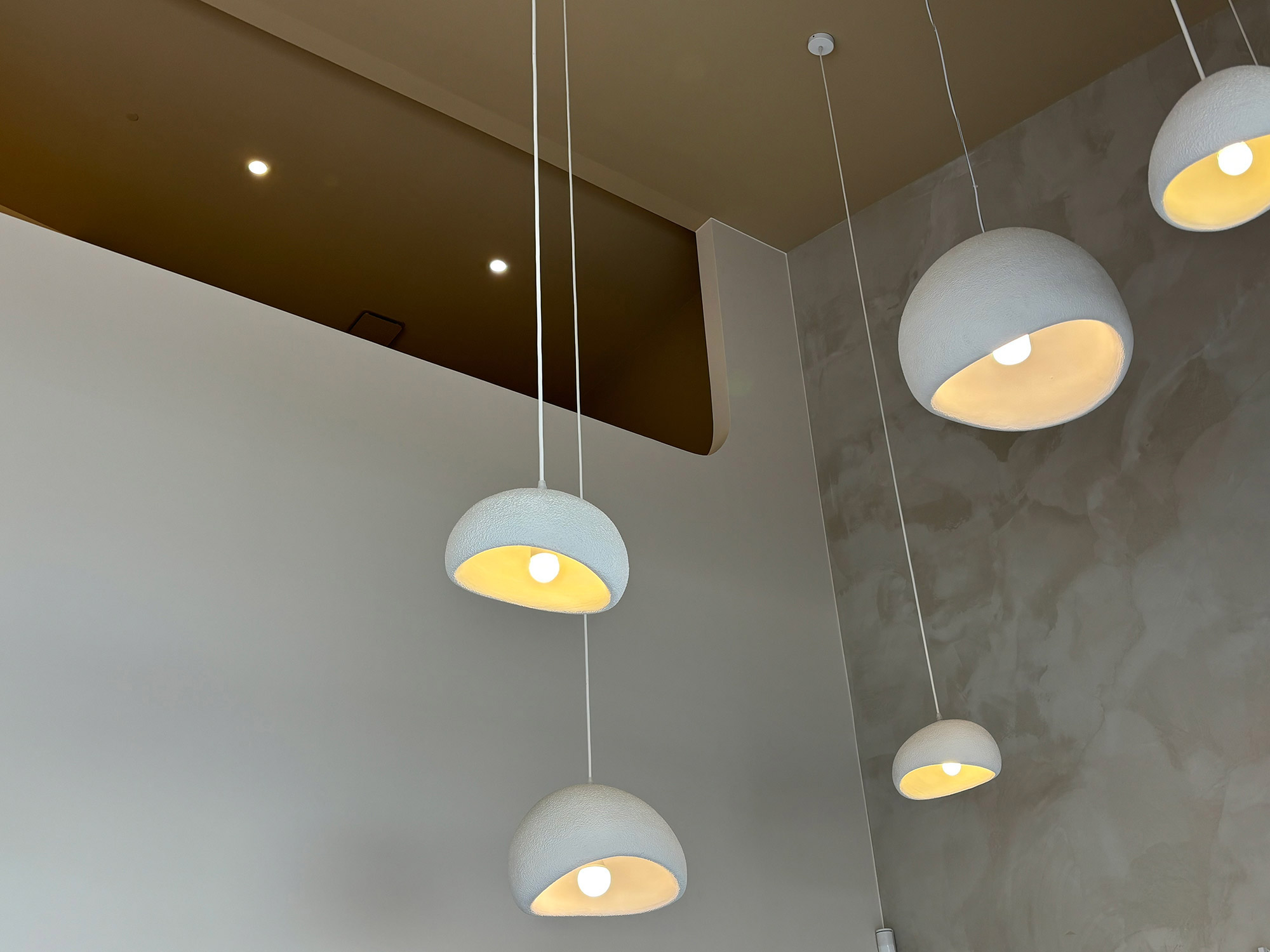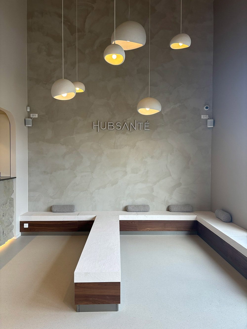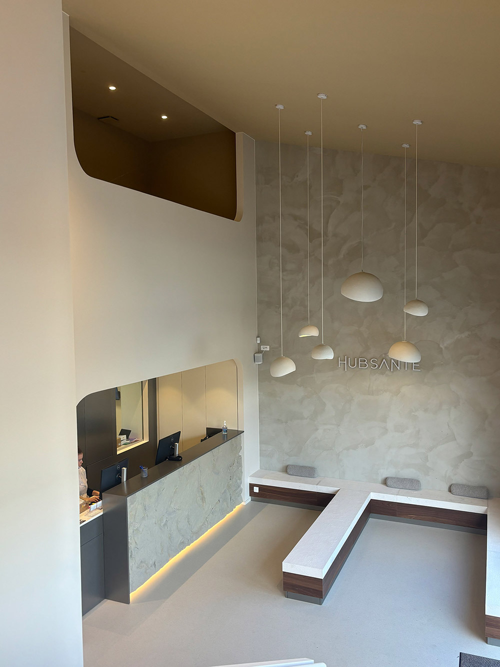 La zone d’accueil incarne cette philosophie. Le comptoir, habillé de pierre élégante et discrètement rétroéclairé, accueille les visiteurs dans un espace aux formes géométriques simples. L’impressionnante hauteur sous plafond est mise en valeur par une série de suspensions organiques qui rythment l’espace avec légèreté. Un mur texturé vient accentuer la profondeur du lieu, tandis que le logo “HUBSANTÉ” s’inscrit avec sobriété, renforçant l’identité visuelle.