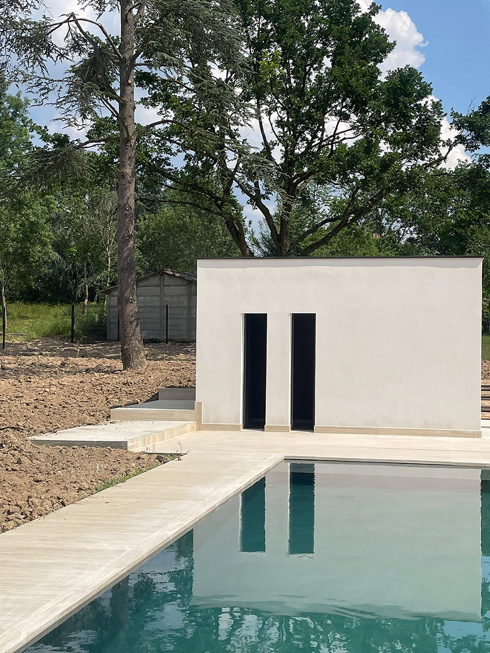 Implantée au coeur d’une vaste parcelle arborée, cette maison, initialement préfabriquée, a fait l’objet d’une réhabilitation complète et d’une extension contemporaine. Seul le soubassement en béton banché a été conservé et agrandi, servant de base à une nouvelle structure en ossature bois isolée.